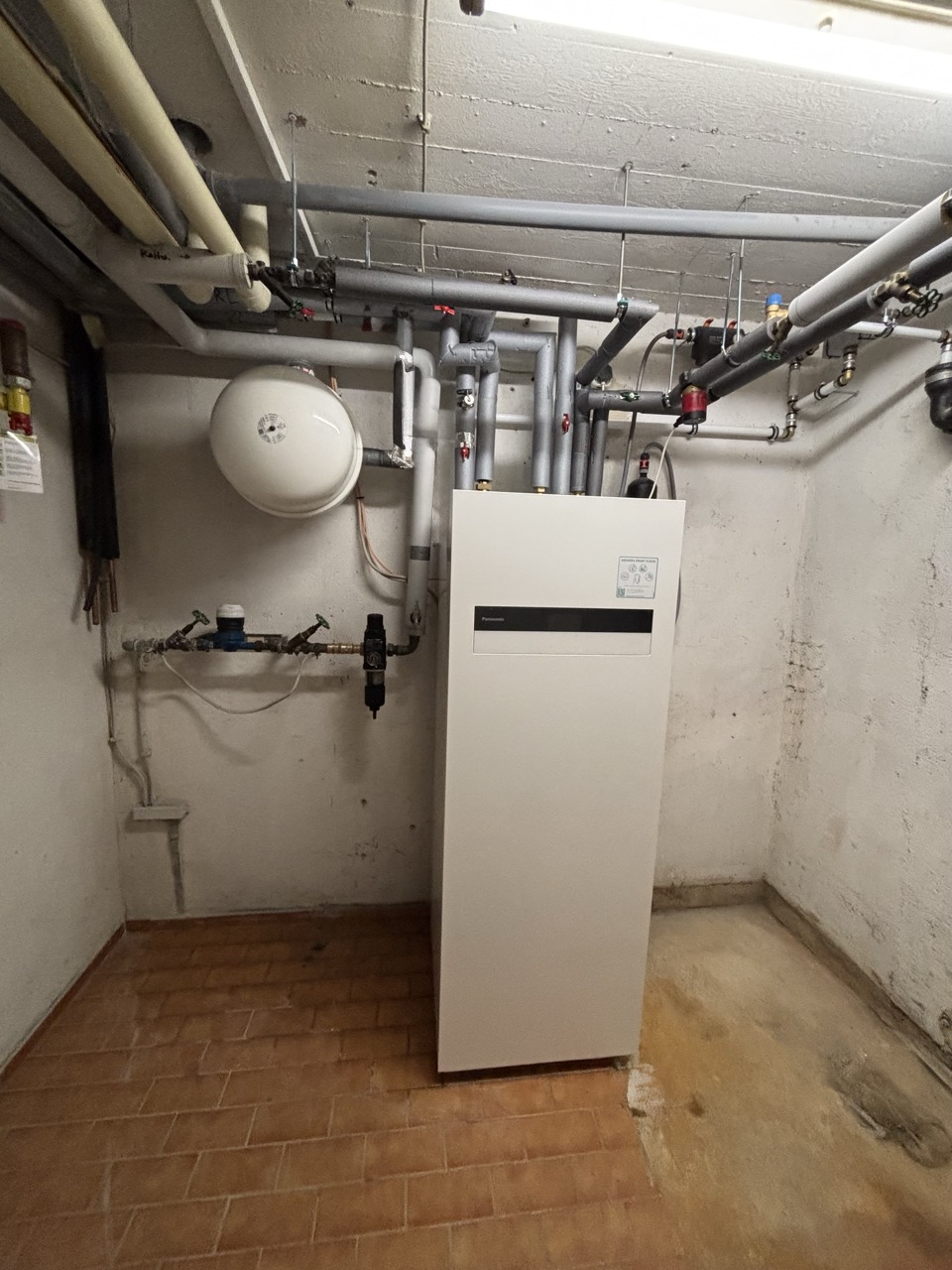 Die bestehende Gas-Heizung unter dem Dach sollte durch eine Wärmepumpe ersetzt werden. Da die Platzverhältnisse im DG beengt waren und Leitungen an der Fassade die Optik des Gebäudes beeinträchtigt hätten, wurde die Heizung in den Keller verlegt. Dafür mussten Steigleitungen wg. geringem Querschnitt erneuert werden.